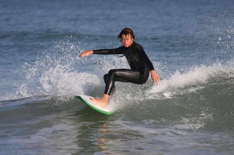 The Lagos is an all-epoxy, super light board. That's a good question that I think a lot of people overlook when shopping around for their first board, so good looking out. In addition to the Lagos being a lot lighter than a glass board, it is also way stronger which is an important consideration if you plan on being bad for a while (kidding). Overall, I recommend epoxy. It's more buoyant and if you are one to care about the environment, epoxy decomposes a lot faster than traditional glass. My friend has a GoPro and got this awesome picture of me on my board (it's epoxy).